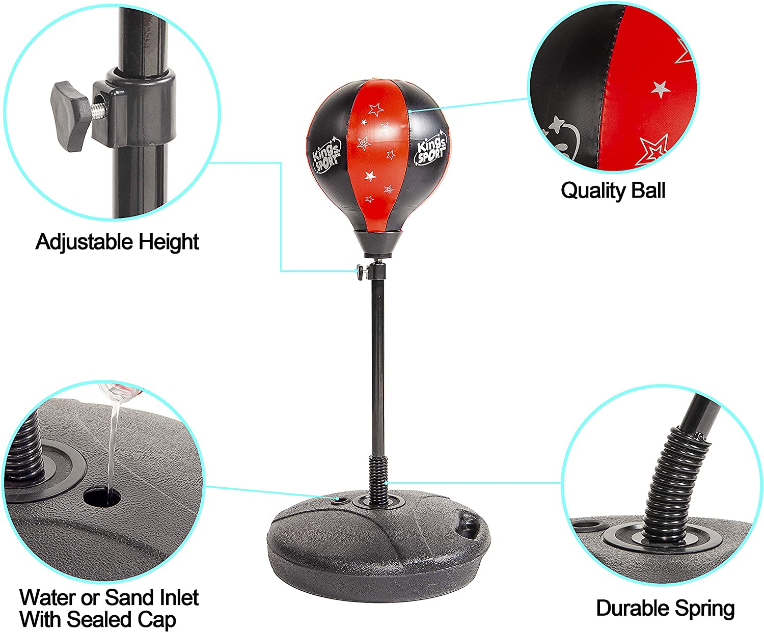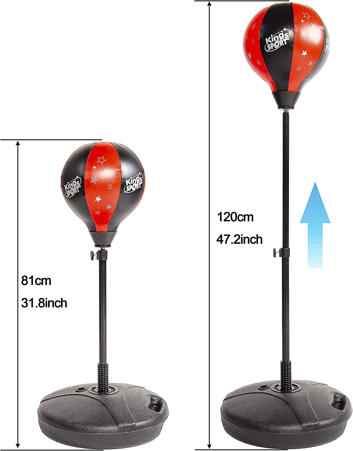 • Height Adjustable Punching Ball Stand: This punching bag with stand can be adjusted between 31” to 47”, which can be adjusted by personal preference
