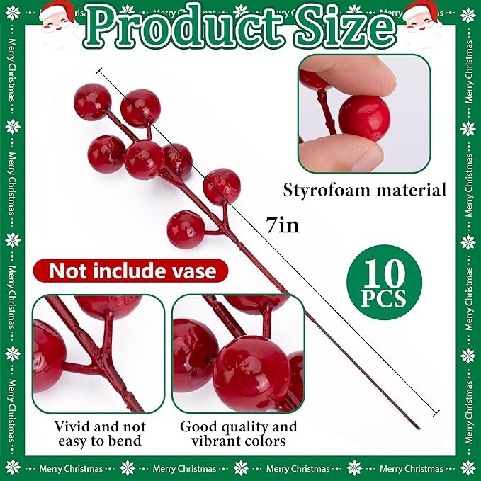 • Widely Used: This red berry Xmas pine branches stems are the perfect decoration for Christmas, New Year, parties and can be used indoors or outdoors. It can be placed in vases or jars to decorate places such as tables, fireplaces, furniture and doors, and can also be used for DIY crafts, wreaths, etc.
